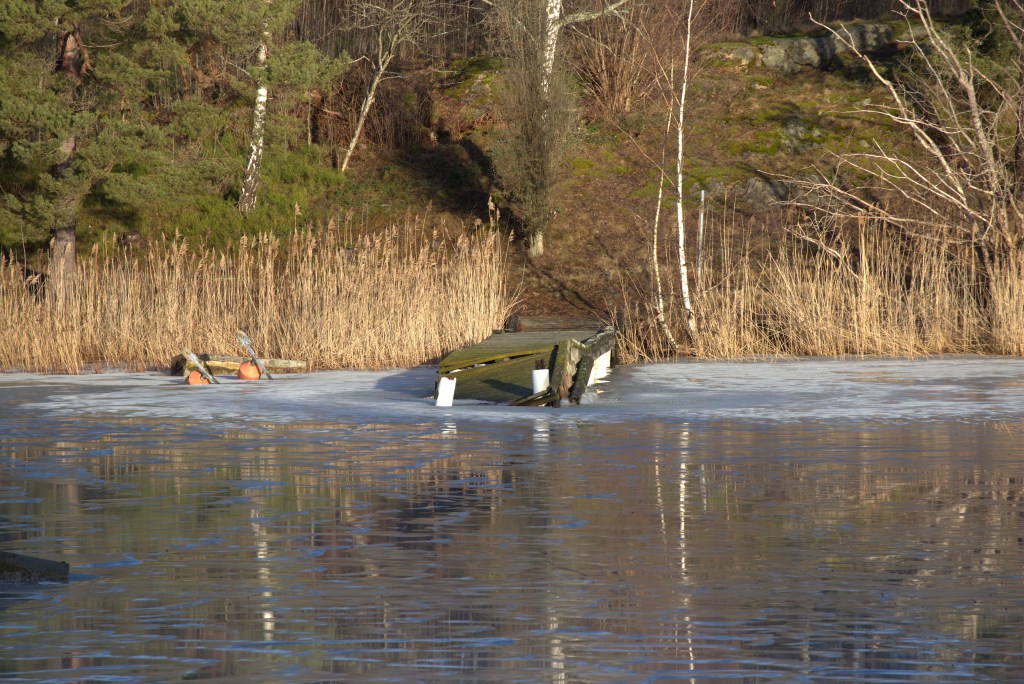 Isen ligger fortfarande kvar på den delen som ligger närmast småbåtshamnen och för mig starten på slingan. Trots att det ser blött ut kan isen fortfarande vara tillräckligt tjock för att jag ska kunna gå på den men jag chansade inte den här gången heller!