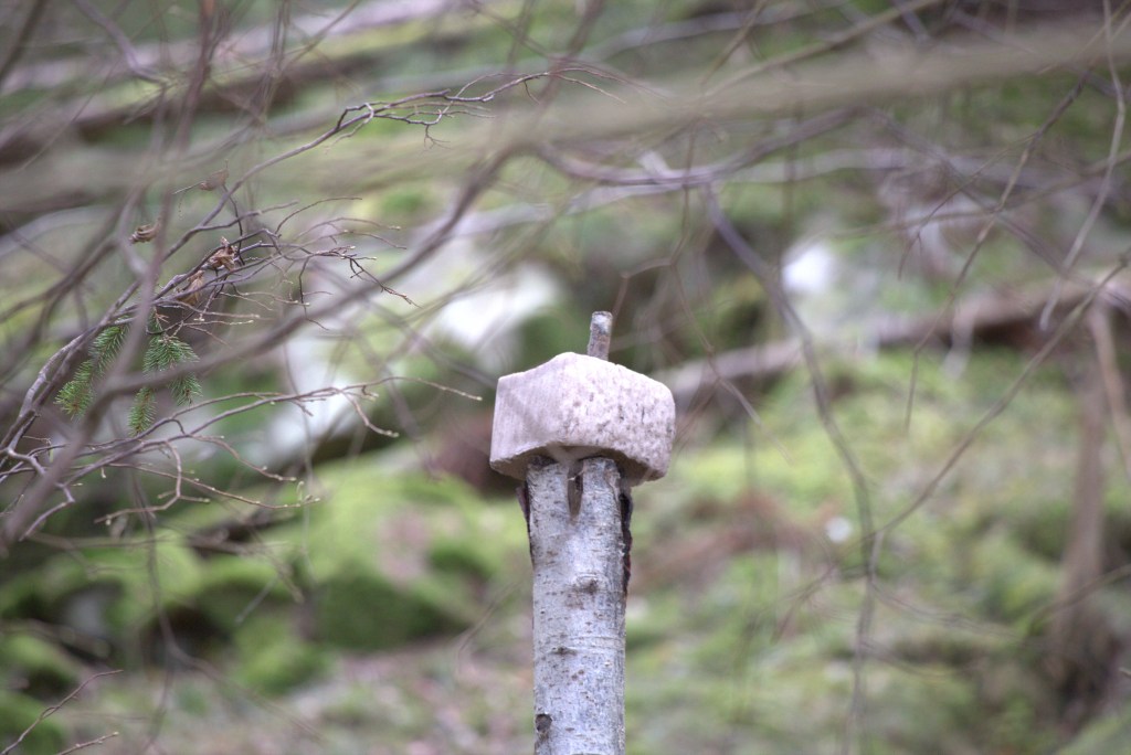 Vi människor lämnar saker efter oss i naturen av olika skäl. Skräp är ju mindre roligt att se och speciellt på en plats där jag just då inte hade möjlighet att ta med skräpet till en bättre plats. Den konstiga saken uppe på björkstammen är dock ett positivt inslag där de lokala jägarna (i det här fallet Jägareförbundet) sätter upp saltstenar så att tex älg kan tillgodose sitt behov av mineraler, givetvis placeras de så att det finns drickbart vatten i närheten!