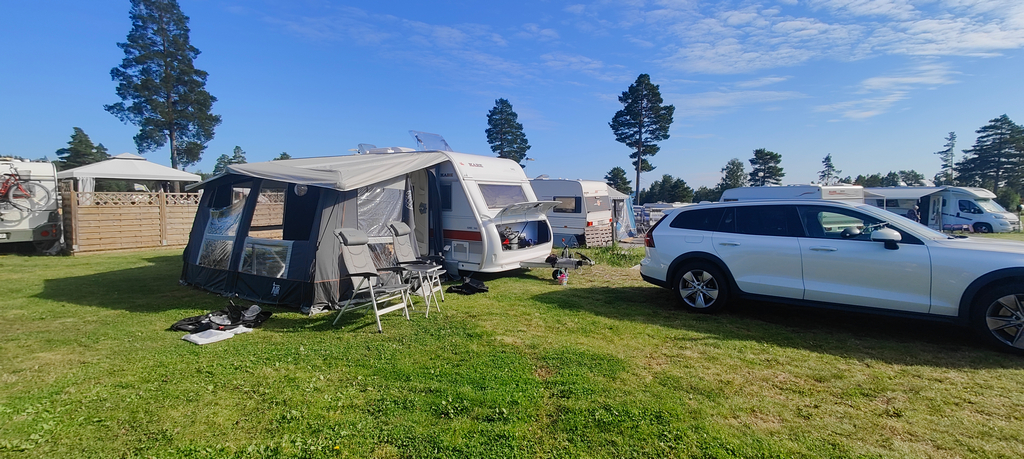 Gullviks camping stod vi på för ett par år sedan med husbilen och då stod vi på husbilsplatserna närmare vägen, den här gången hamnade vi granne med skogen på en av de stora platserna (röd plats) eftersom vi helst ville ha lite mer utrymme för spring på tomten. Perfekt plats, speciellt som det inte kom någon till platsen ovanför oss.