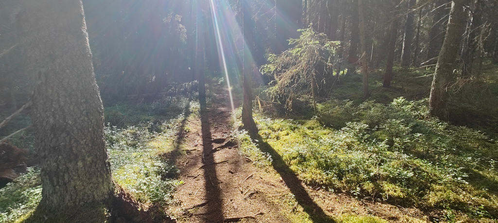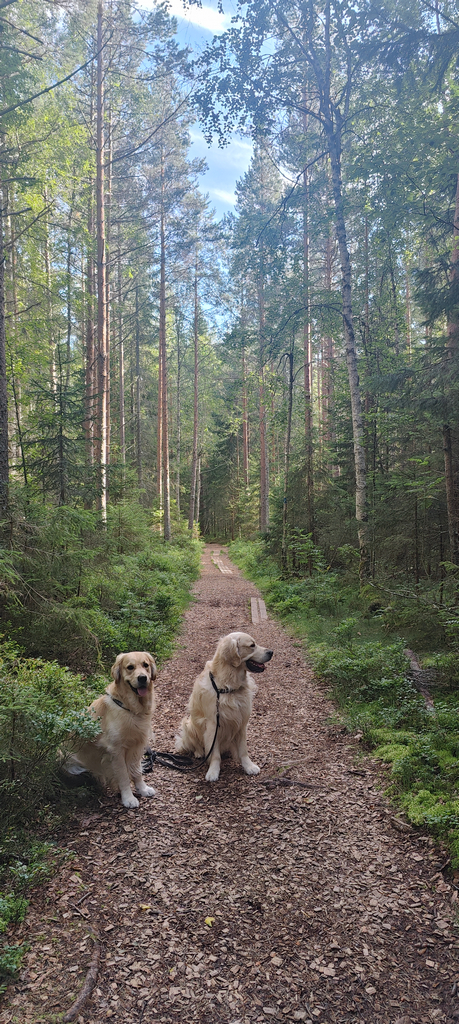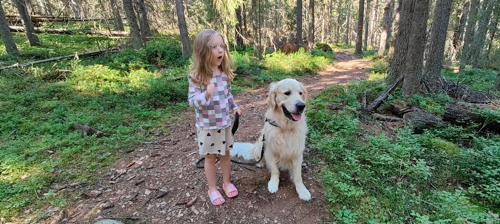 Det vi inte gjorde förra gången var att gå i skogen, vi hade valp den gången och promenaderna blev rätt korta, men det borde vi ha gjort! Snett emot vår tomt är en av entréerna till de ”leder” som finns och de är helt kanonbra! Rundslinga som kom tillbaka till samma plats eller någon av de andra lederna gjorde ingen skillnad alla var bra markerade och underhållna. Om man ska vara gnällig så fanns det en del mygg men vad kan man vänta sig i Norrland när det dessutom finns en del stående vatten.